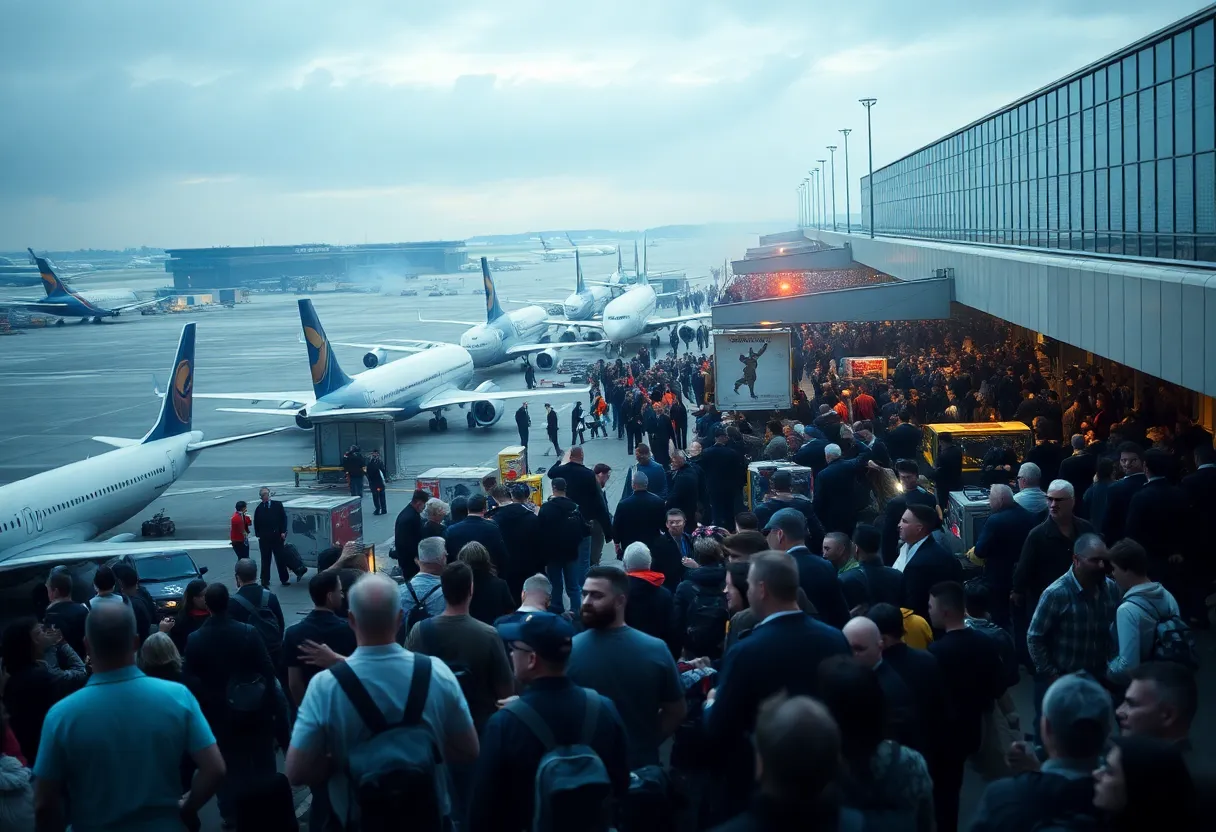 A chaotic scene at Heathrow Airport with passengers waiting amidst grounded flights.