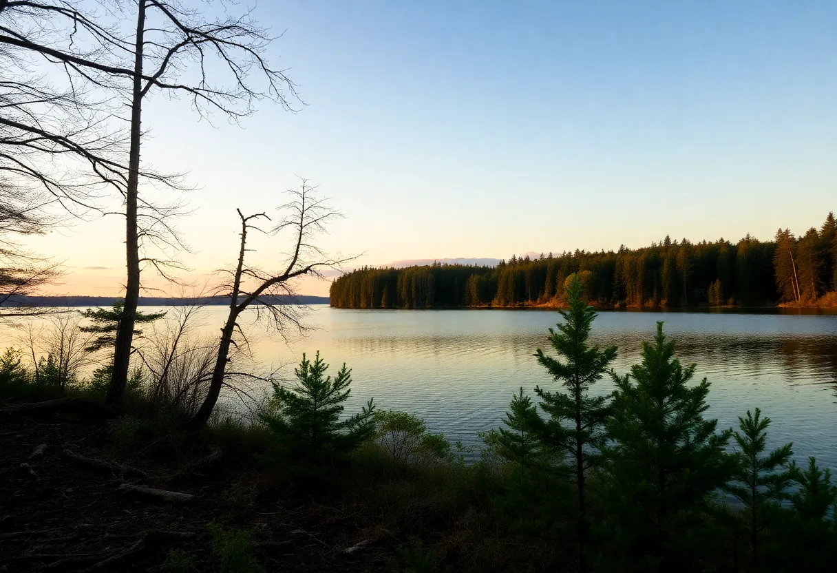 A tranquil lake view surrounded by forests in Michigan.