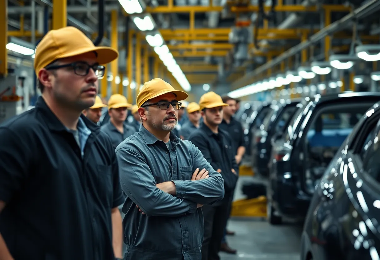 Workers at Stellantis assembly line showing concern over layoffs